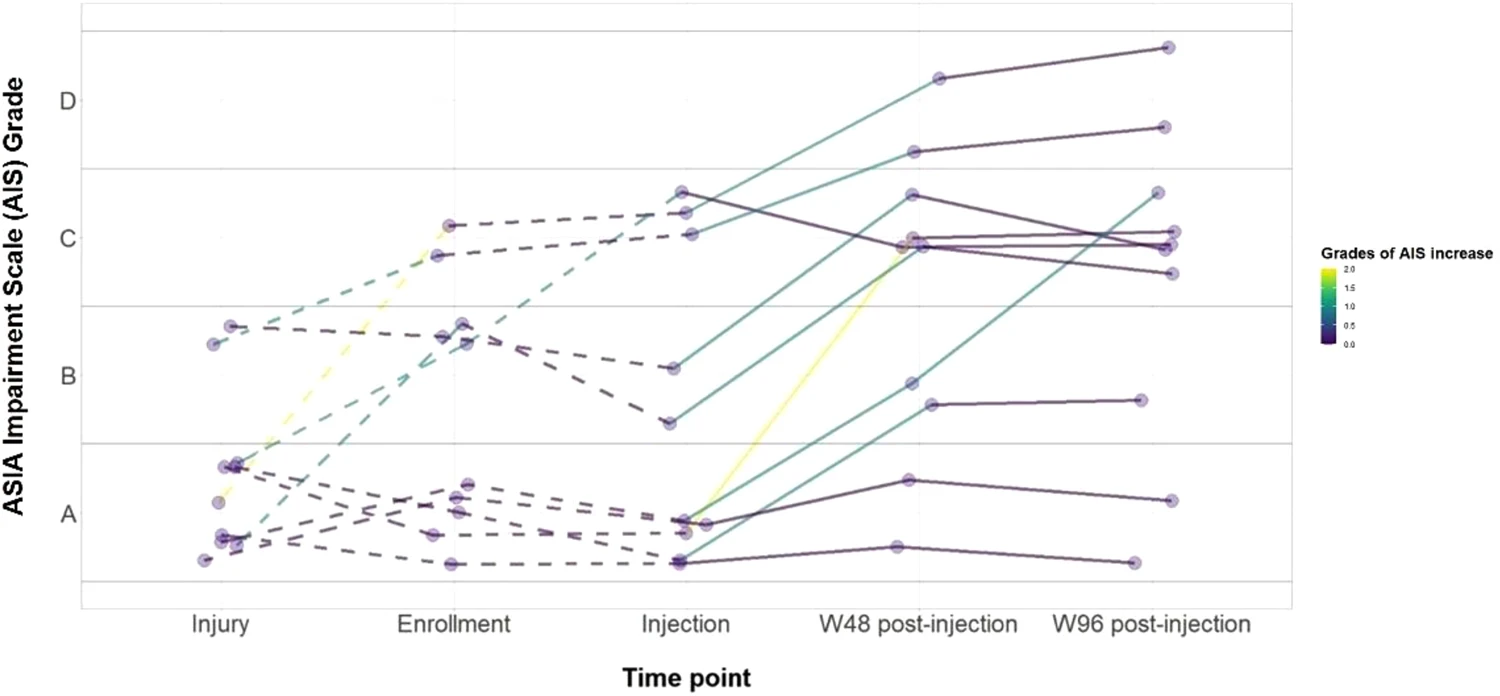 메이요 클리닉(Mayo Clinic)은 세계 최대 병원그룹이다. 17년부터 19년까지 척수손상 환자 14명을 모았다. 모집기준은 척수손상이 가장 심한 A, B레벨(ASIA레벨) 대상이고, 등록일 당시 사고후 1년 미만이며, 더이상 진전이 없이 고착된 환자들이다. 그중 기준에 부합되지 않거나 서명을 거부한 사람을 빼고, 10명이 시험 대상이었다.